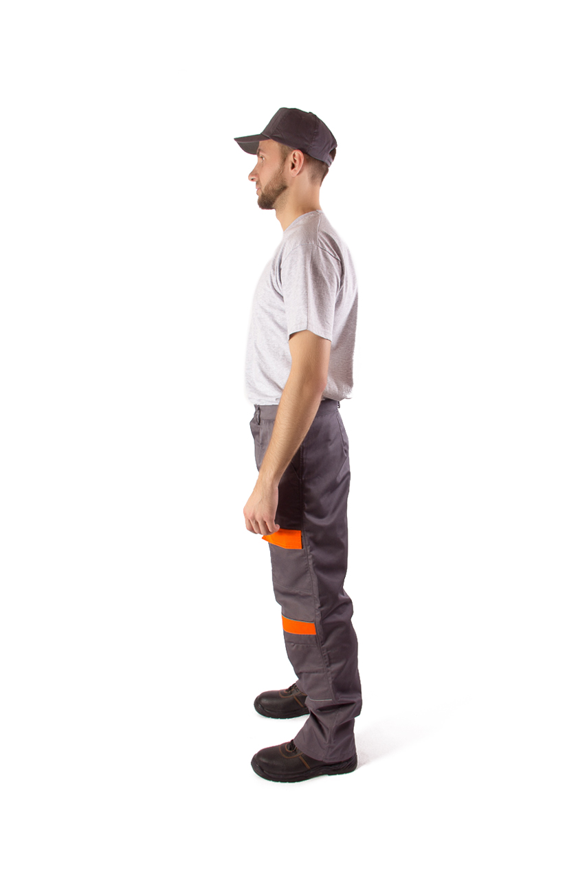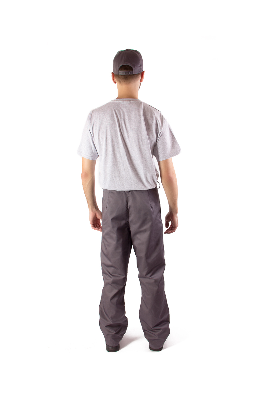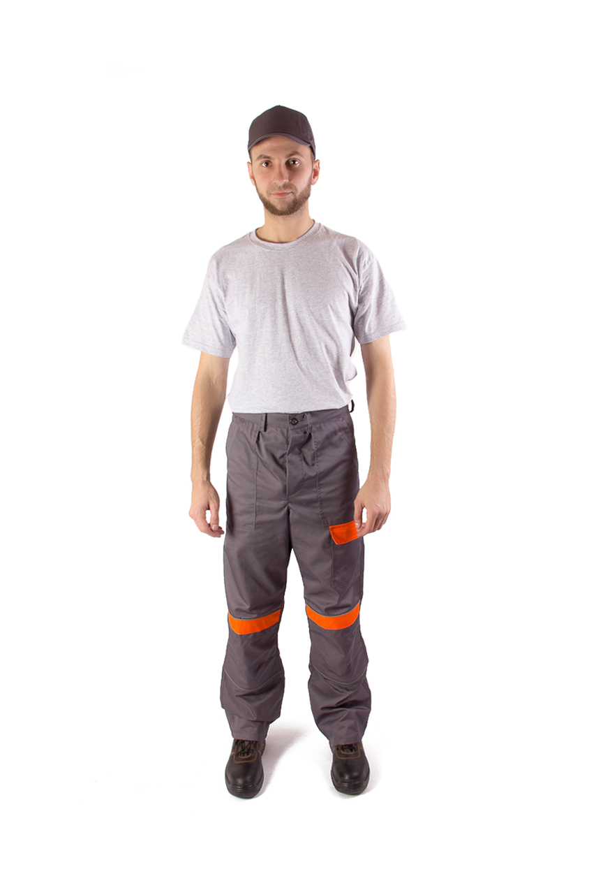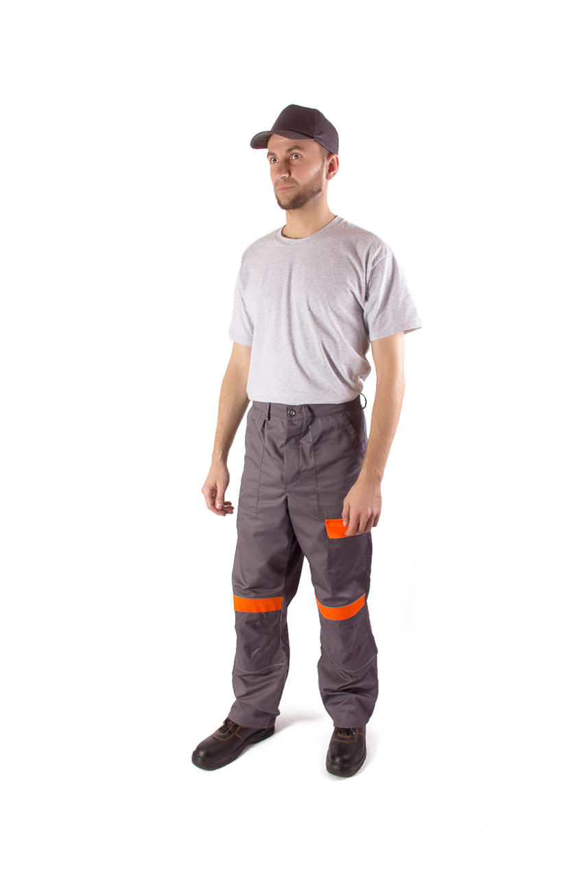 Брюки прямые, на втачном поясе с хлястиками. На передней части брюк два боковых накладных косых кармана. Застежка «гульфик» на пуговицах. На уровне колена на передней половине брючин настроченные объемные наколенники с вытачками. Над и под наколенником вшит светоотражающий кант.
