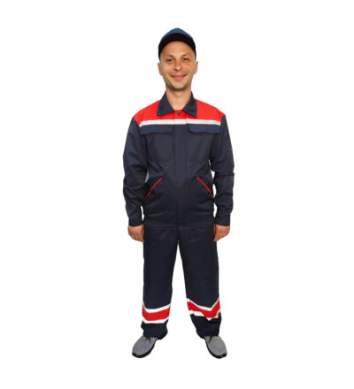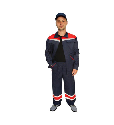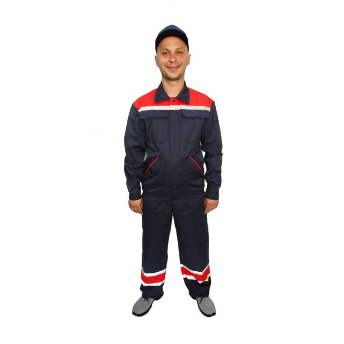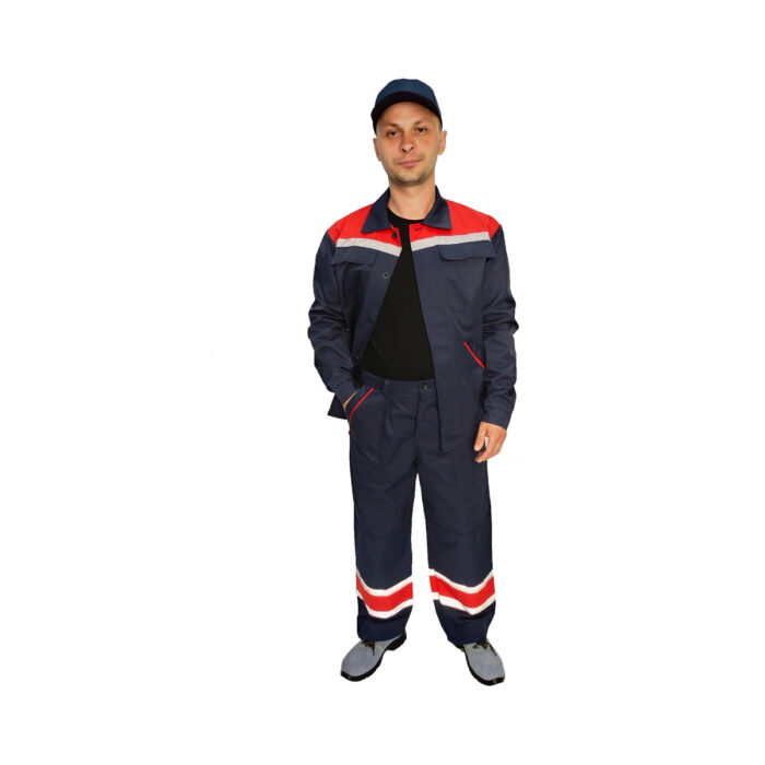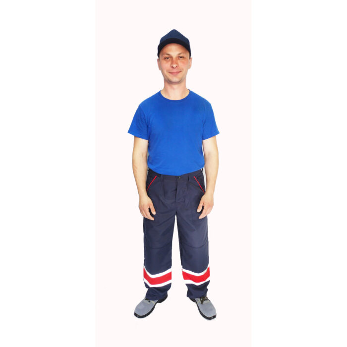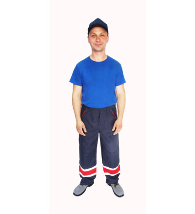 Брюки прямые, на поясе. На передней части брюк два боковых накладных косых кармана, с вточеным кантом из ткани отделки. Застежка «гульфик» на пуговицах. На уровне колена настроченные  наколенники. Под наколенником нашиты светоотражающие полосы (ширина 2,5 см), которые размещены по краю цветной вставки из отделочной ткани.