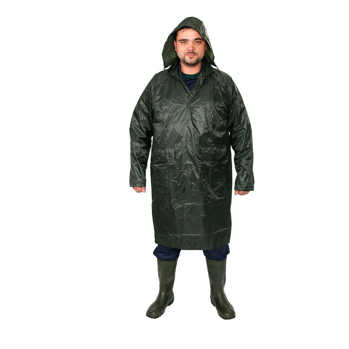 Плащ прямого силуэта с центральной застежкой на кнопках. Спинка с отрезной кокеткой с вентиляционными отверстиями. Рукава втачные одношовные, с внутренним манжетом на резинке. Воротник – стойка, в карман которого вшит капюшон. Карманы – накладные с клапаном.