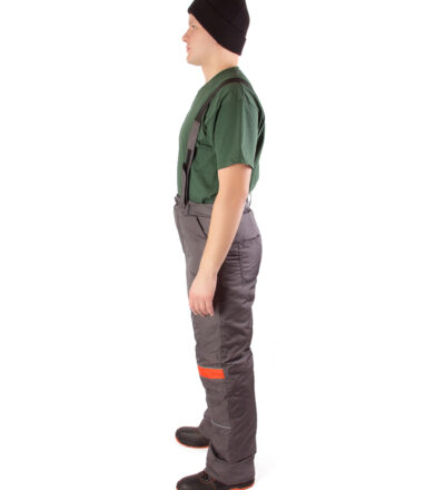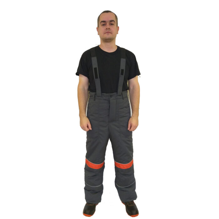 На передней части брюк настроченные два боковых накладных косых кармана. На уровне колена на передней половинке брюк настроченные объемные наколенники с выточками. Над и под наколенники вшитый светоотражающий кант.