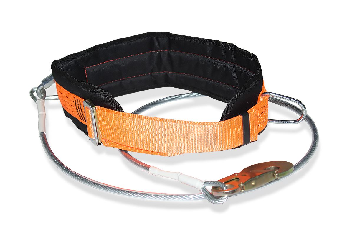 Пояс предохранительный ПБ- 4 состоит из кушака, ремня с пряжкой, которая позволяет в экстренной ситуации быстро освободиться от пояса, двух установленных на ремне колец, к одному из которых неразъемным соединением крепиться строп-трос с карабином. Предназначен для выполнения работ на высоте, при угрозе повреждения стропа (газорезка, сварка, острые кромки конструкций). В отличии от ПБ-1 имеет меньший вес.