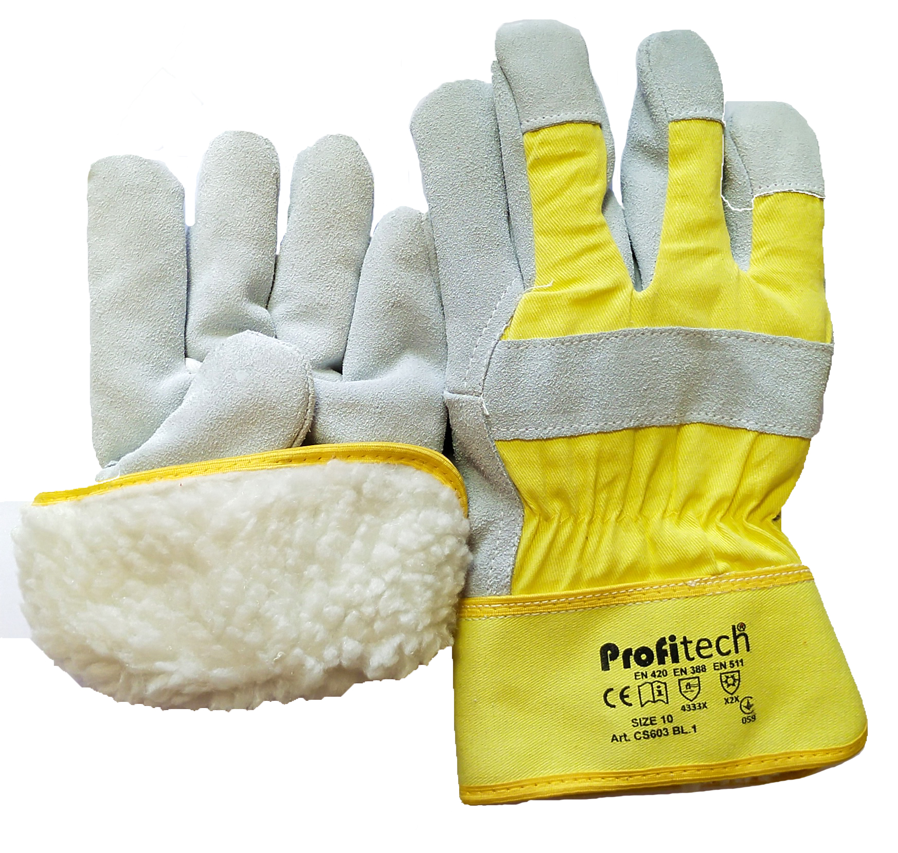 Комбинированные рабочие перчатки из говяжьего спилка, утепленные меховой подкладкой. Верх рабочих перчаток выполнен из хб ткани.
