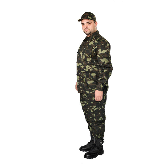 Куртка прямого силуету з центральною потайною застібкою. На верхній частині пілочок куртки настрочено накладну нагрудну кишеню – книжку з клапаном на текстильних застібках (липучках). Спинка з кокеткою, нижня частина цільна, в великих розмірах допускається шов по середині. На талії кулиска з втягнутим шнурком. Комір відкладний. Рукава вточені двошовні, з приточеним манжетом на ґудзиках . У верхній частині рукавів накладні кишені – книжка з клапаном на текстильних застібках. По плечових швах настрочено погони на ґудзиках (можливий варіант без погон).