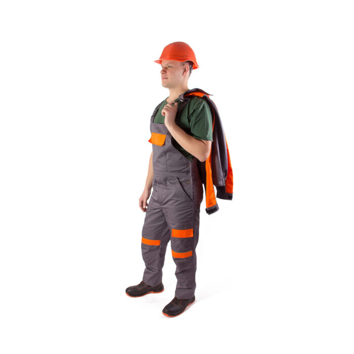 Перед напівкомбінезона з відрізною грудкою, на якій пришита накладна кишеня з клапаном на липучці. Пояс з хлястиками . На передній частині штанів настрочені дві бічних накладних косих кишені. Застібка «гульфик» на ґудзиках. На рівні коліна на передній половинці штанів настрочені об’ємні наколінники з виточками. Над і під посилюючою накладкою ( наколінник) вточено світлоповертаючий кант.