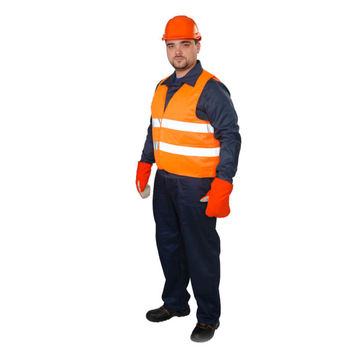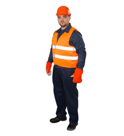 Жилет відноситься до спеціального одягу підвищеної видимості, призначеного для візуального позначення людей, що його носять, при денному освітленні, та вночі у світлі автомобільних фар. Жилет прямий, із застібкою на липучці. Горловина v-подібна. Жилет має таке розташування сигнальних смуг: навколо торса – дві смуги світловідбиваючої стрічки шириною 5 см.