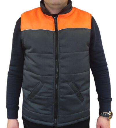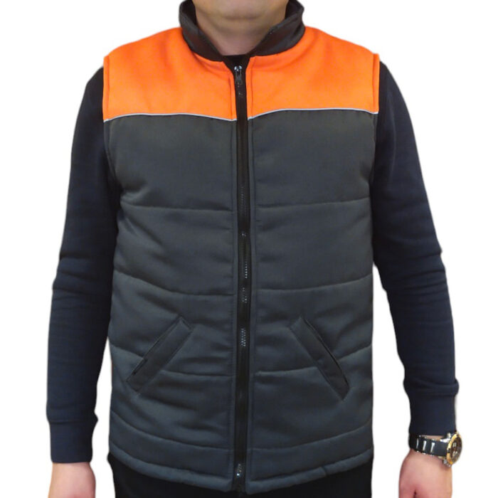 Пілочки з відрізними кокетками з оздоблювальної тканини, по краю кокетки пришито світловідбивний кант. Внизу жилета – прорізні кишені. Внутрішня кишеня на лівій пілочці.
